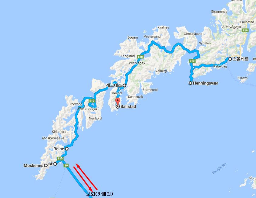 노르웨이 로포텐제도 4박5일로포텐제도는 Austvågøy, Vestvågøy, Moskenesøy, Flakstadøy 4개 섬으로 이루어져 있다. 오슬로에서 국내항공으로 보되Bodo 까지 이동하고 보되에서 카페리로 모스케네스 Moskenes 까지 이동한다. 로포텐제도는 대중교통이 없어 렌트카로 둘러보아야 하는데, 보되 공항에서 빌리고 반납하는 것이 바람직하다. |